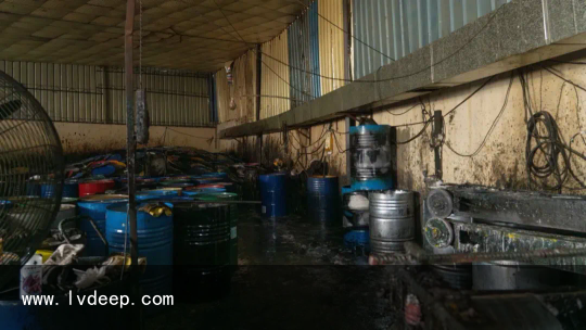 「工廠情況」 現場危險指數滿星據現場工人供認廢鐵桶從外面收回來后他們就直接切割下廢鐵桶的蓋子和底部再通過平整機壓平桶身然后打包作為鐵皮進行售賣