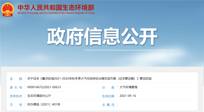 為深入打好污染防治攻堅戰(zhàn),持續(xù)改善重點區(qū)域秋冬季環(huán)境空氣質(zhì)量,生態(tài)環(huán)境部起草了《重點區(qū)域2021-2022年秋冬季大氣污染綜合治理攻堅方案(征求意見稿)》。要求于2021年9月22日前反饋。